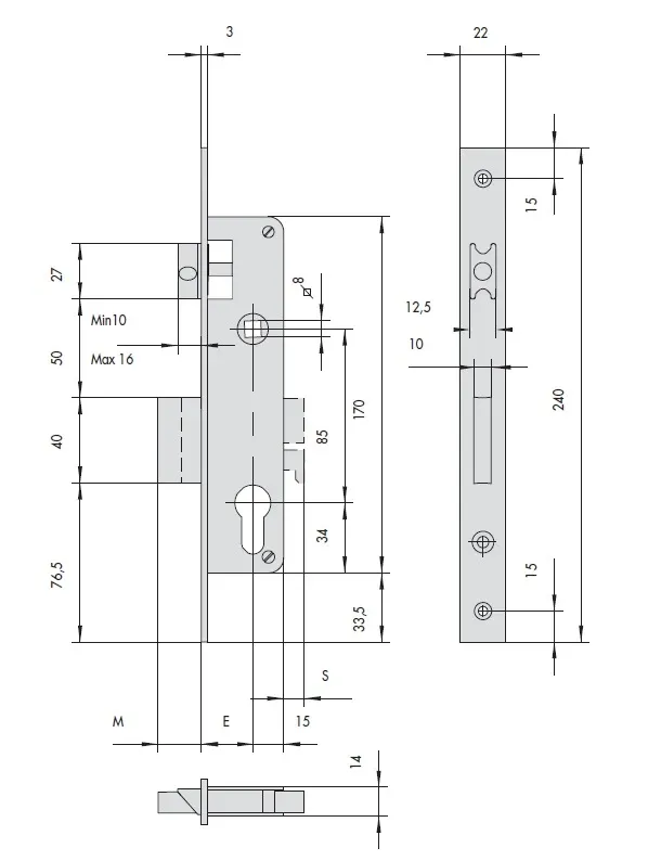 Корпус врезного узкопрофильного замка Cisa 44660.35.0 для установки в алюминиевые, пластиковые, узкопрофильные двери. Механизм секретности - цилиндровый механизм (не входит в комплект). Удаление ключевого отверстия от планки (Бэксет) - 35 мм. Межосевое расстояние - 85 мм. Замок реверсивный (универсальный) - направление защелки меняется путем перестановки.